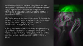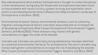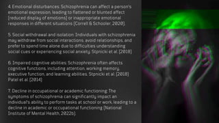 This document discusses schizophrenia, including its common symptoms, types, causes, and treatments. It notes that schizophrenia has several types including paranoid, disorganized, catatonic, and undifferentiated. The primary treatment is antipsychotic medication, which works to reduce symptoms by affecting neurotransmitters like dopamine. Psychotherapy can also be used as an additional treatment.