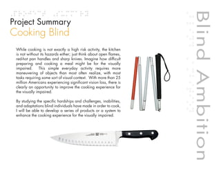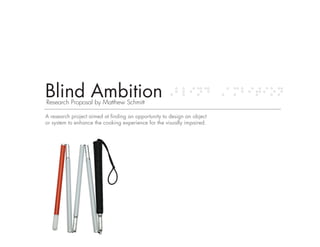 This research proposal aims to design objects or systems to enhance the cooking experience for the visually impaired. The researcher will study the challenges blind individuals face when cooking, such as maneuvering in the kitchen, identifying ingredients, measuring, and knowing when food is fully cooked. He has recruited support from both experienced and inexperienced blind cooks. Preliminary research found pouring liquids and measuring to be the most difficult tasks. The researcher will focus on adapting existing products and developing new designs to help blind people with food preparation, cooking processes, and cleaning up.