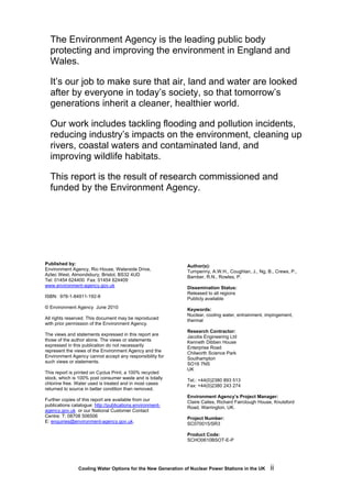 This document discusses cooling water options for new nuclear power stations in the UK. It provides an overview of different cooling system designs, including direct once-through systems and various cooling tower options. It evaluates the environmental impacts of water abstraction and thermal discharges for each system. While direct cooling can have impacts on aquatic life from intake and discharge, the document finds it can be considered best available technology if best practices for design, mitigation and compensation are followed. Site-specific factors will also determine the suitability of different options.