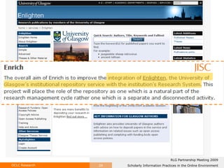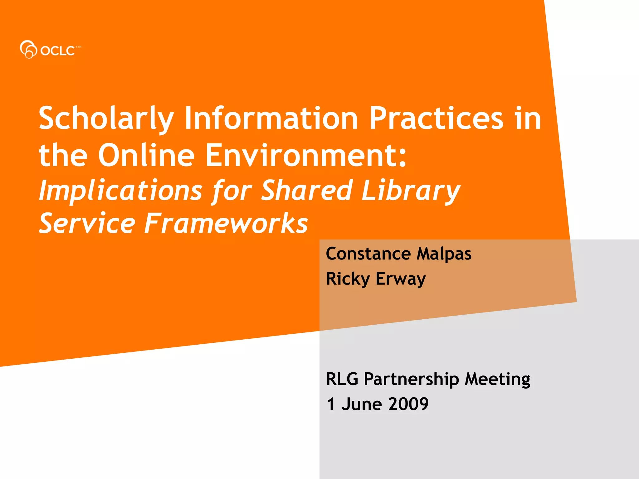The document discusses opportunities for libraries to develop shared service frameworks based on scholars' core activities in the online environment. It analyzes literature on scholarly information practices to identify common themes across disciplines. Key findings show convergence in practices like searching, collecting, and collaborating. This implies a need for generic models of core library services to support current research workflows. Frameworks based on scholars' information needs could help libraries invest strategically and avoid duplicating efforts.