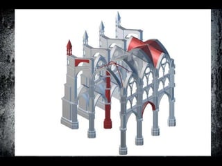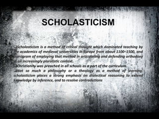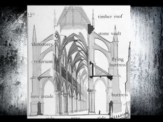 The document summarizes key aspects of late medieval scholasticism, the Crusades, Gothic architecture, and French Gothic architecture. Scholasticism emphasized rigorous dialectical methods and conceptual analysis. Major scholastic thinkers included Anselm, Abelard, Aquinas. The Crusades were a series of wars launched by European Christians against Muslims to control holy sites like Jerusalem. Gothic architecture featured pointed arches, ribbed vaults, and flying buttresses, emphasizing verticality and light. French Gothic styles progressed from Early Gothic to Rayonnant and Flamboyant styles over centuries of cathedral construction.