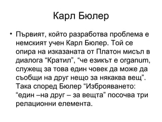 Карл Бюлер Първият,който разработва проблема е немският учен Карл Бюлер. Той се опира на изказаната от Платон мисъл в диалога “Кратил”, “че езикът е organum , служещ за това един човек да може да съобщи на друг нещо за някаква вещ”. Така според Бюлер “Изброяването: “един –на друг – за вещта” посочва три релационни елемента.
