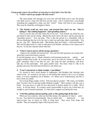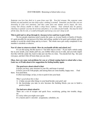 2) It provides advice for navigating social interactions and academic responsibilities at school during this difficult time. Suggestions include being open with teachers about struggles, taking it one day at a time, and finding support from friends or a counselor.