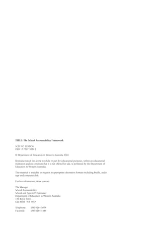 This document outlines the School Accountability Framework established by the Department of Education in Western Australia. The framework has four key components: 1) schools are required to produce annual plans setting objectives and priorities; 2) schools must self-assess student achievement and school effectiveness; 3) schools provide a public School Report on performance; and 4) District Directors review each school's performance. The framework is intended to ensure accountability while supporting school improvement efforts.