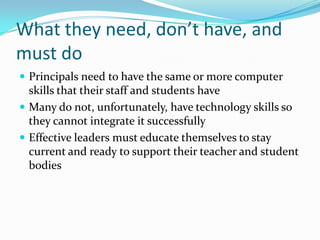School administrators need strong technology skills to support teachers and students, but many lack these skills due to factors like growing up before the technology revolution and limited training opportunities. To improve their skills, administrators should self-assess their abilities, seek out available training programs, stay up to date on technology changes, and lead by example through their own technology use. They can then help provide technology professional development for teachers and help the whole school integrate technology effectively.