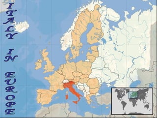 Italy is located in Europe and has a diverse landscape that includes mountains, plains, seas, lakes, rivers, and islands. Some major Italian cities are Rome, Milan, Turin, Venice, and Naples. Italy has a rich culture with renowned art, food, textiles, mechanics, and cars like Ferrari, Fiat, Alfa Romeo, and Lamborghini. Milan is Italy's economic capital and home to the important fashion industry. Italy has a school system that includes nursery, primary, secondary, and university education with vocational and technical schools.