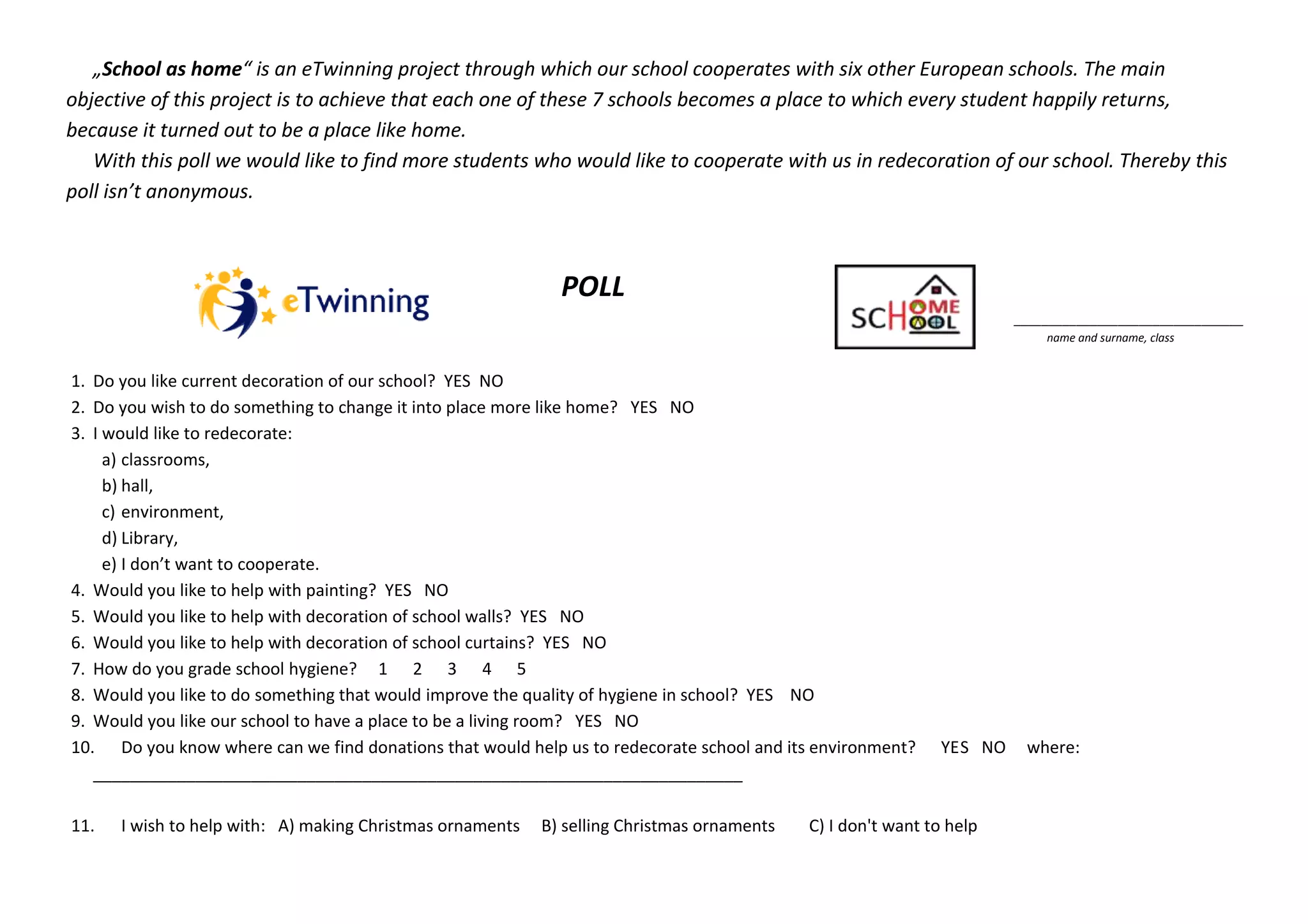 The document outlines the 'school as home' eTwinning project, involving cooperation among seven European schools to create a welcoming environment for students. A poll is included to gather student input on school decoration and hygiene, as well as their willingness to participate in redecoration efforts. The poll seeks to understand student preferences on various aspects of the school environment, including suggestions for improvements and support roles in the project.
