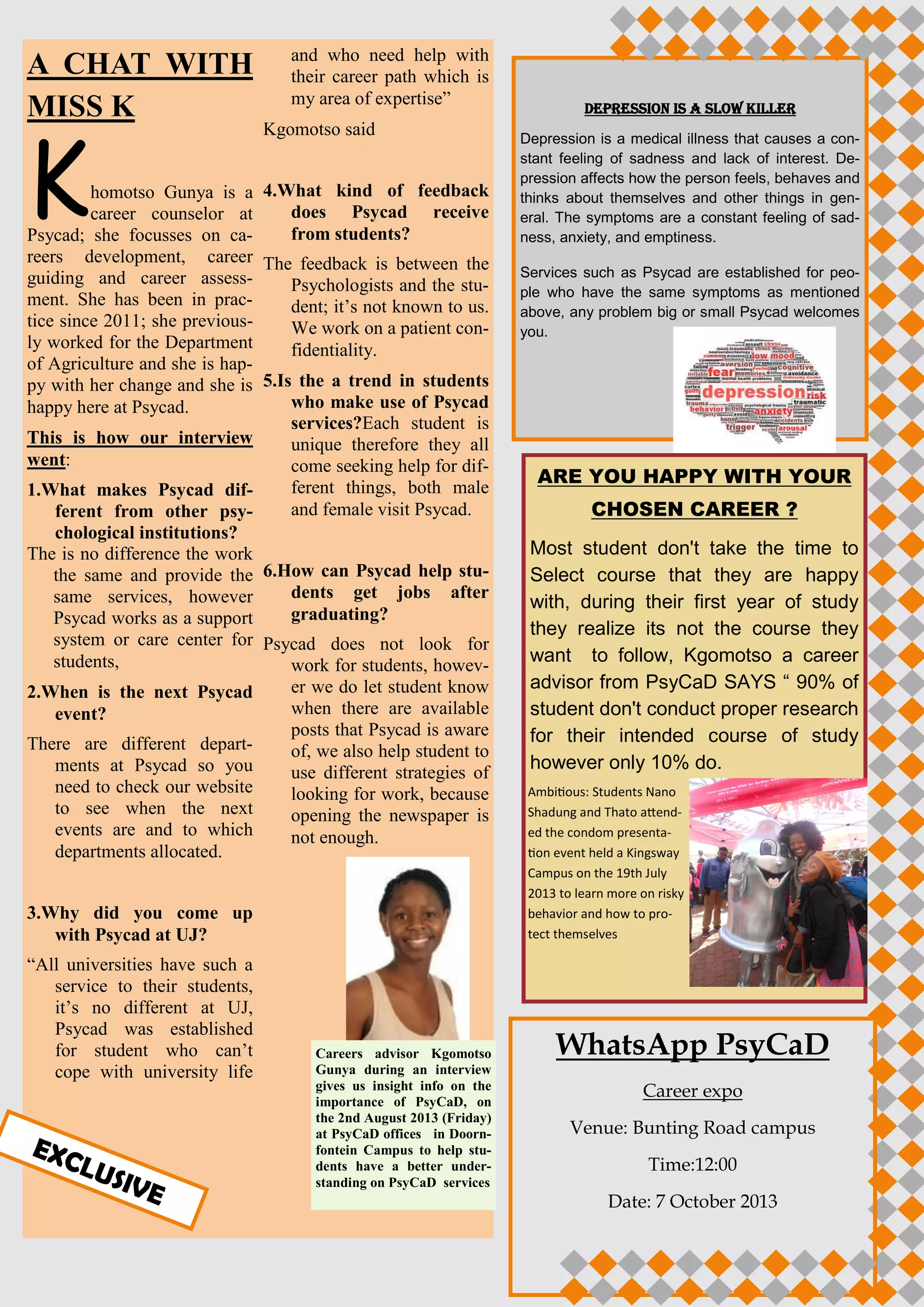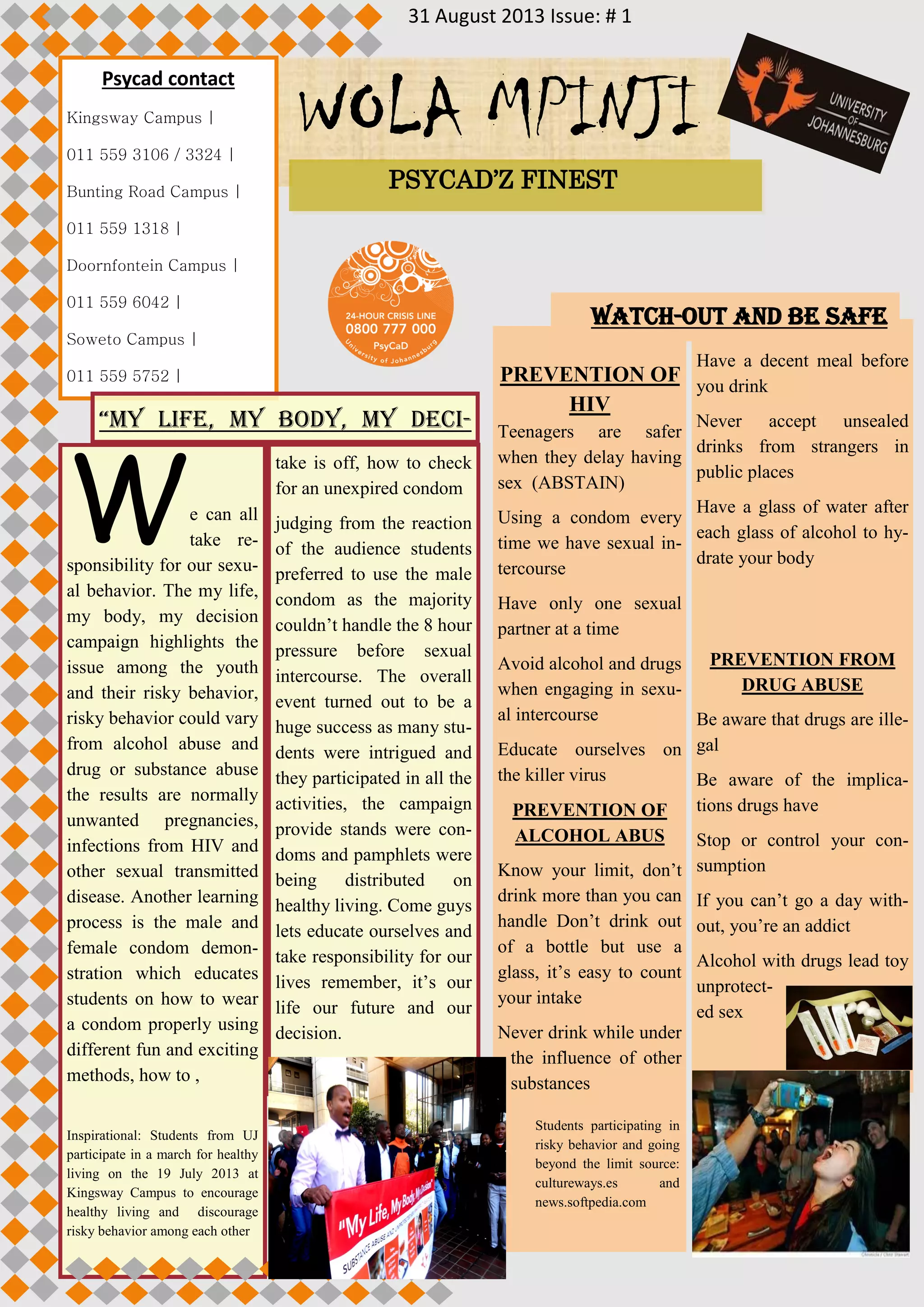 The document discusses Psycad's services for students at various UJ campuses to address risky behaviors like substance abuse and unprotected sex. It describes an event where students learned how to properly use male and female condoms and the reactions from students. The overall event was a success with many students participating and receiving condoms and pamphlets on healthy living. Psycad aims to educate students and encourage them to take responsibility for their health and futures.