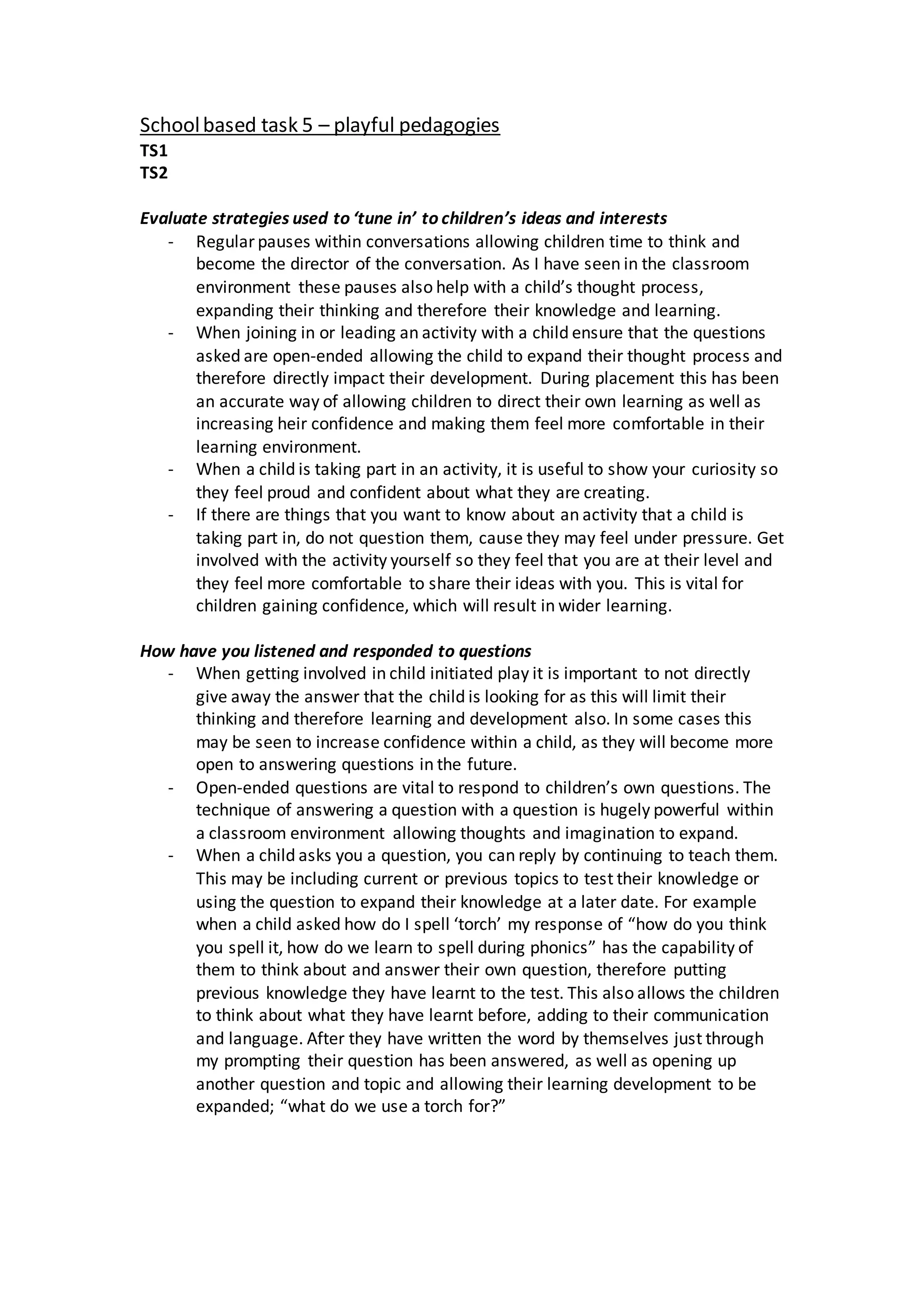 1) The document discusses strategies for effectively engaging with children during play, such as regularly pausing to allow children time to think and direct conversations, asking open-ended questions, and showing curiosity in children's activities.