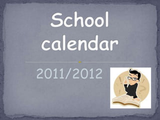The document summarizes the 2011/2012 school year calendar for Poland. It begins on September 1st and ends on June 29th, with summer holiday during July and August. There are two semesters separated by a two week winter holiday. Important dates include national holidays, religious observances, and the written Matura exam at the end of the school year.