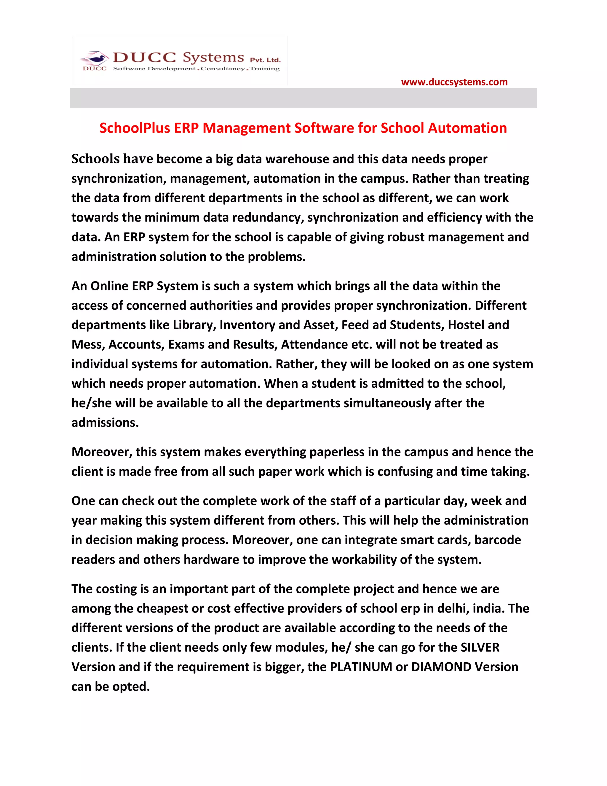 The document describes an online ERP school management software called SchoolPlus that integrates data from departments like admissions, library, exams, attendance, and accounts to automate operations and make them paperless. It discusses implementation processes, pricing options ranging from Silver to Diamond packages that include different modules, and services provided like training, data migration, and technical support. The software aims to provide a robust administration solution for schools to manage their data and operations more efficiently through a centralized system.