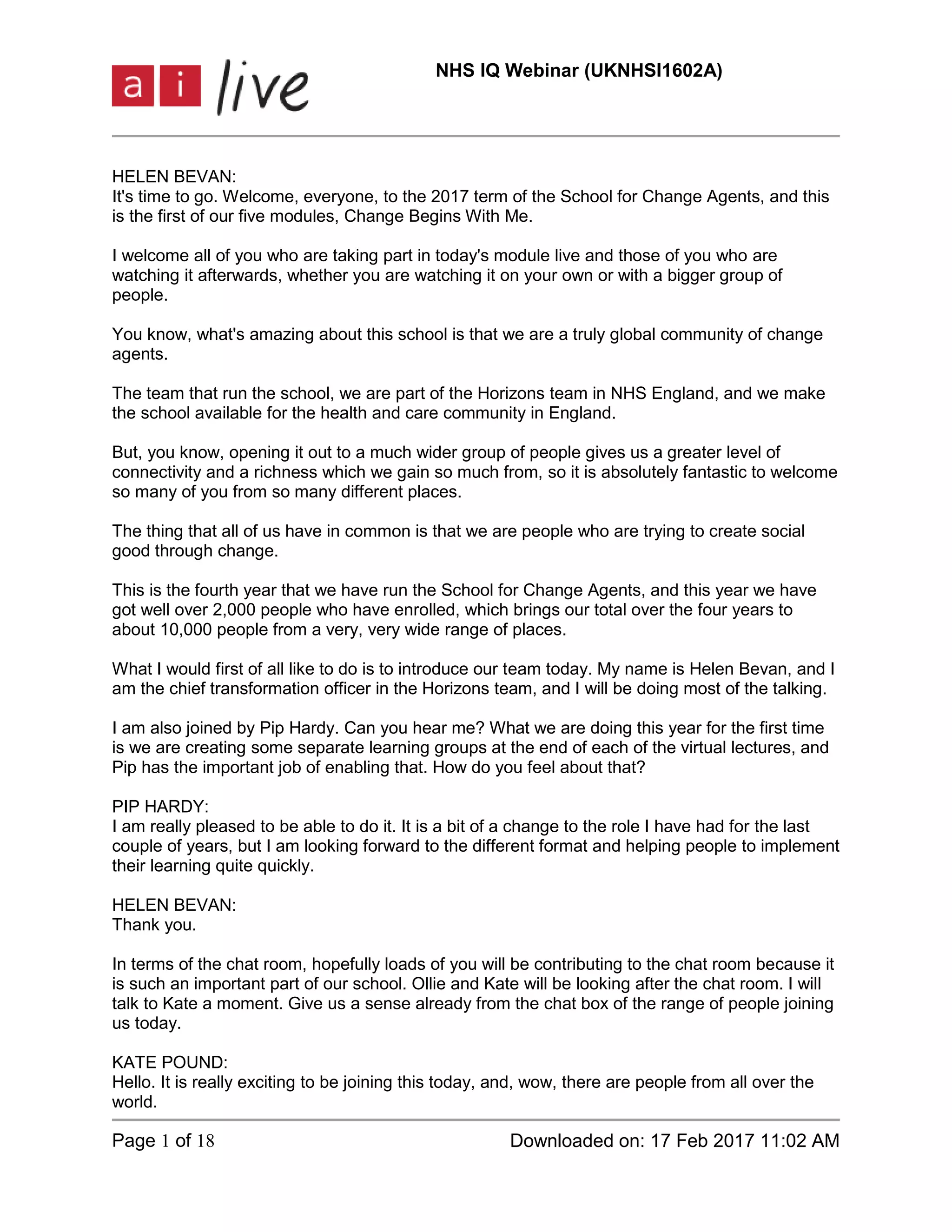 The document introduces the 2017 School for Change Agents, led by Helen Bevan, aimed at creating social good through change in health and care. It emphasizes the importance of building capability among change agents while fostering a global community, with over 2,000 participants this year. The curriculum includes five modules focusing on essential capabilities for effective change agents, including themes of self-efficacy and the importance of connecting with others for collaborative learning.