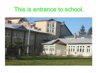 This document provides a tour of different areas of a school, including the science classroom with maps and an aquarium, the canteen where students have lunch, the computer classroom for learning ICT, the gym for playing sports like football and volleyball, the playground for playing after school, and the cloakroom for storing shoes and jackets. The tour is authored by several students named Adrian, Jakub, Zuzanna, Regina, and Tomek.