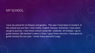 1) The student loves their school for its flowers and garden. They have been studying in Grade 6 and enjoy subjects like math, English, and Russian.