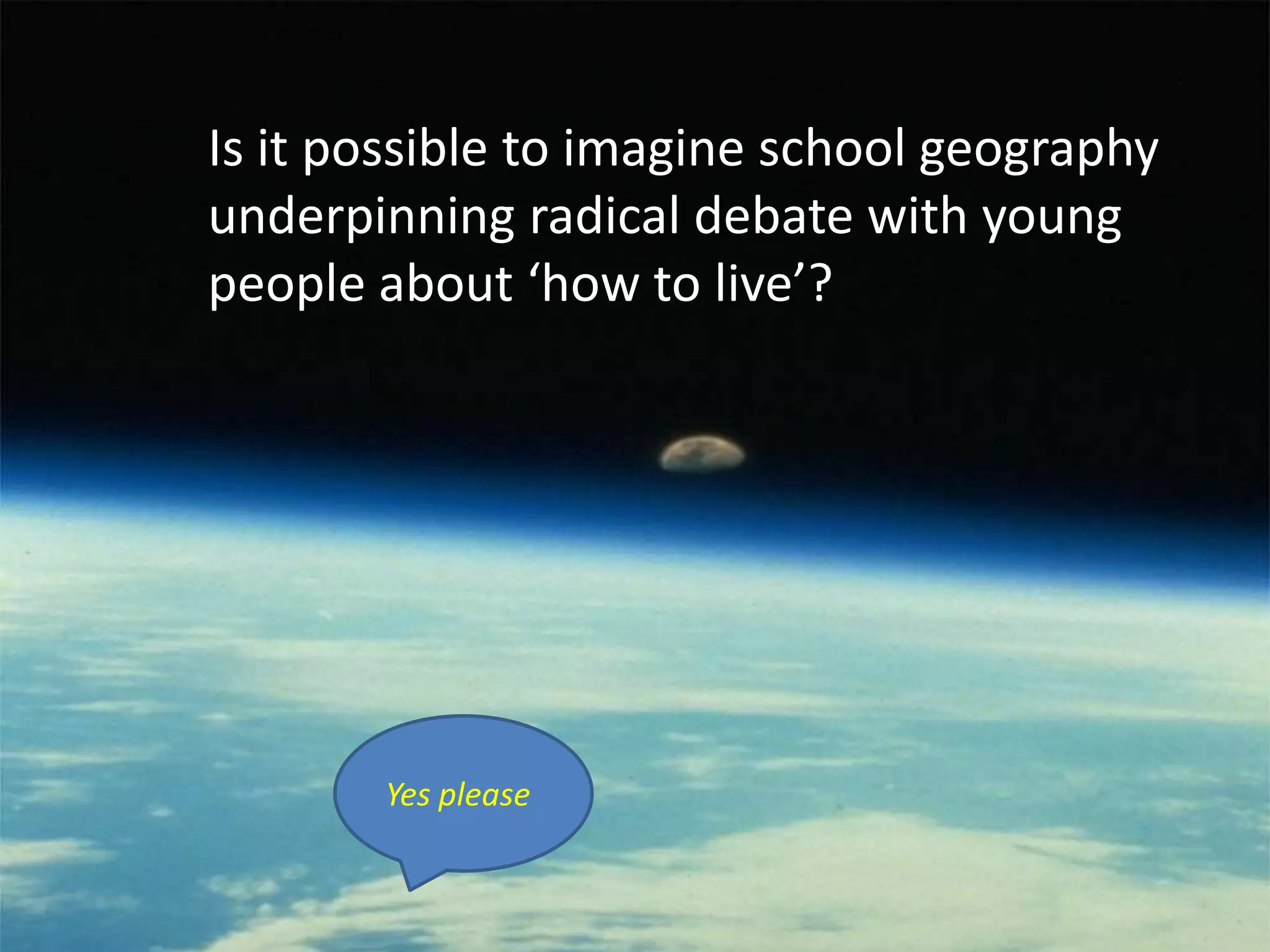 This document discusses the importance and purpose of teaching geography in schools. It argues that geography education should go beyond just imparting facts and instead aim to develop students' capabilities to understand the complex world. These capabilities include understanding identity and place, physical and human environments, and students' role in local and global issues. The goal is for students to "travel with a different view" and make the world a better place through geographical inquiry that encourages questioning and critical thinking about social, economic and environmental challenges. Key concepts and processes in geography teaching should focus on developing students' world knowledge, relational understanding of people and places, and disposition to consider links between different systems.