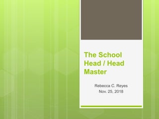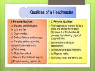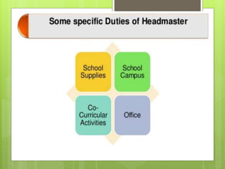 The document outlines the roles and responsibilities of a school head or headmaster. It discusses setting the mission, vision, goals and objectives of the school; creating an environment conducive to teaching and learning; implementing, monitoring and assessing the school curriculum; developing the school education program and improvement plan; administering and managing personnel, physical, and fiscal resources; and establishing school and community networks. The school head is also responsible for accepting donations in accordance with existing laws, and performing other functions assigned by education officials.