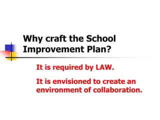 The document provides information about formulating a School Improvement Plan (SIP) for 2016-2019. It discusses the legal basis for having an SIP, what an SIP entails, and the SIP planning process. The SIP is a 3-year roadmap that identifies interventions to be undertaken with community stakeholders. It is formulated based on school data and aims to improve learner outcomes. The planning process involves assessing the school's situation, identifying priority areas for improvement, determining objectives and root causes, and planning interventions over a 3-year timeframe. Key areas of focus for the SIP are access, quality, and governance of education. The workshop will guide participants through exercises to analyze school data and processes, select improvement areas, and develop the SIP.