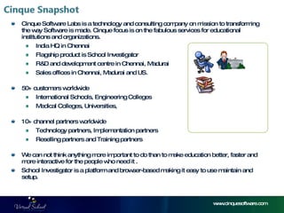 Cinque Software Labs is an Indian technology company that develops School Investigator, a web-based school management system. School Investigator allows schools to manage student records, attendance, grades, homework assignments, and communication between teachers, parents and students. It aims to improve education quality and effectiveness through empowering students, parents and teachers with real-time access to information and assessment tools.