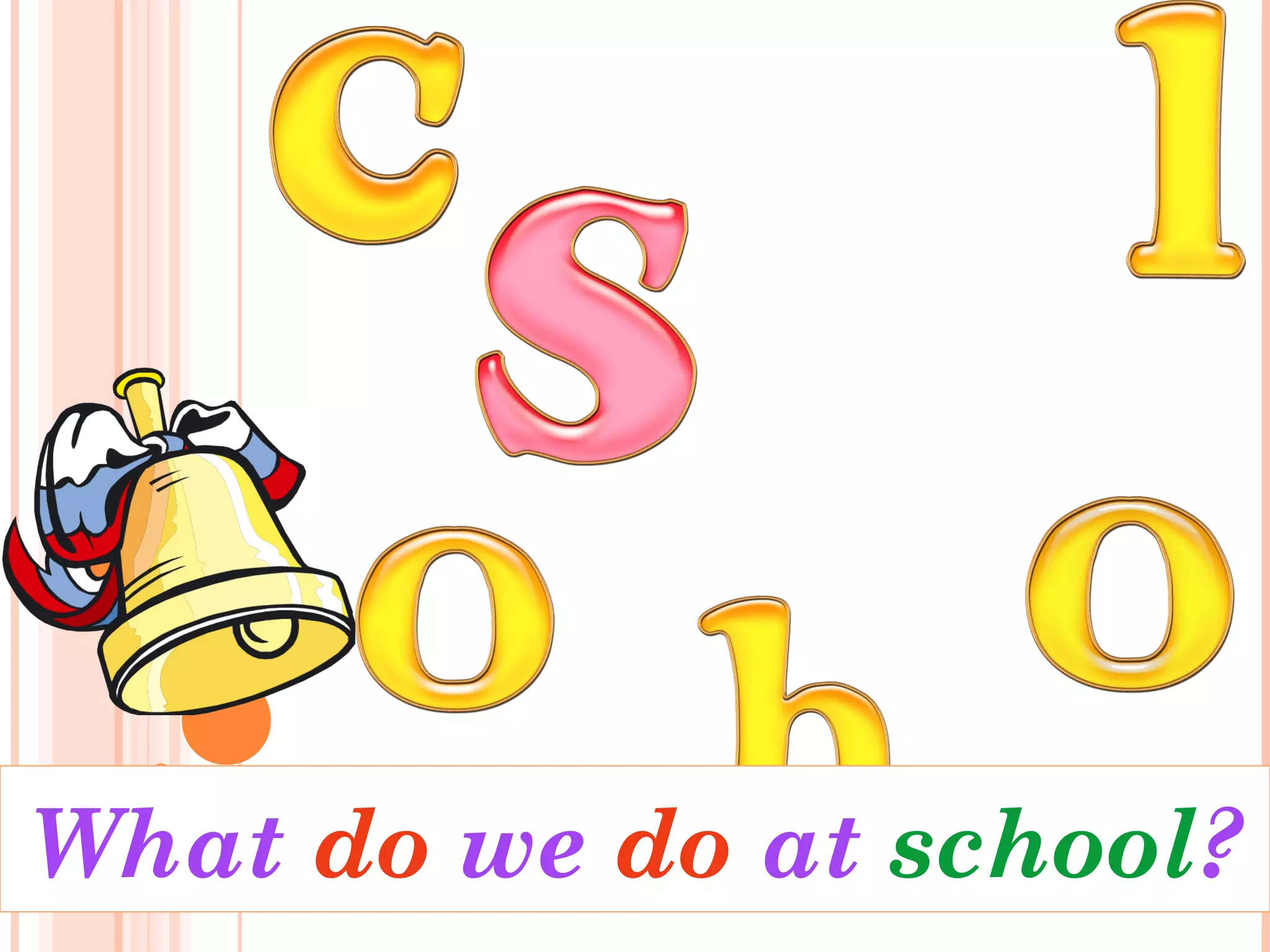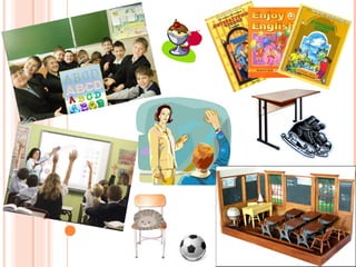 The document discusses what students usually do at school. It mentions that students read, speak to the teacher, talk to the board, draw, ask questions, learn things by heart, sit at tables, take breaks, and talk to classmates. It also mentions that a typical English classroom contains desks, a board, and chairs. Students in English class usually learn, speak, sing, answer questions, translate, watch English films, write, read stories and poems, and learn poems by heart.