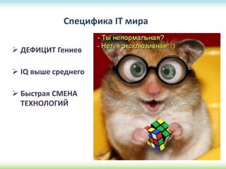 Документ описывает специфику работы IT-рекрутера в условиях дефицита талантов в Украине, включая важные навыки и актуальные тенденции на рынке. Он охватывает различные форматы компаний, такие как продуктовые, аутсорсинговые и стартапы, а также аспекты мотивации специалистов в разных проектах. Особое внимание уделяется методам поиска и привлечения IT-специалистов, включая стратегии формирования привлекательных вакансий и использование различных ресурсов для рекрутинга.