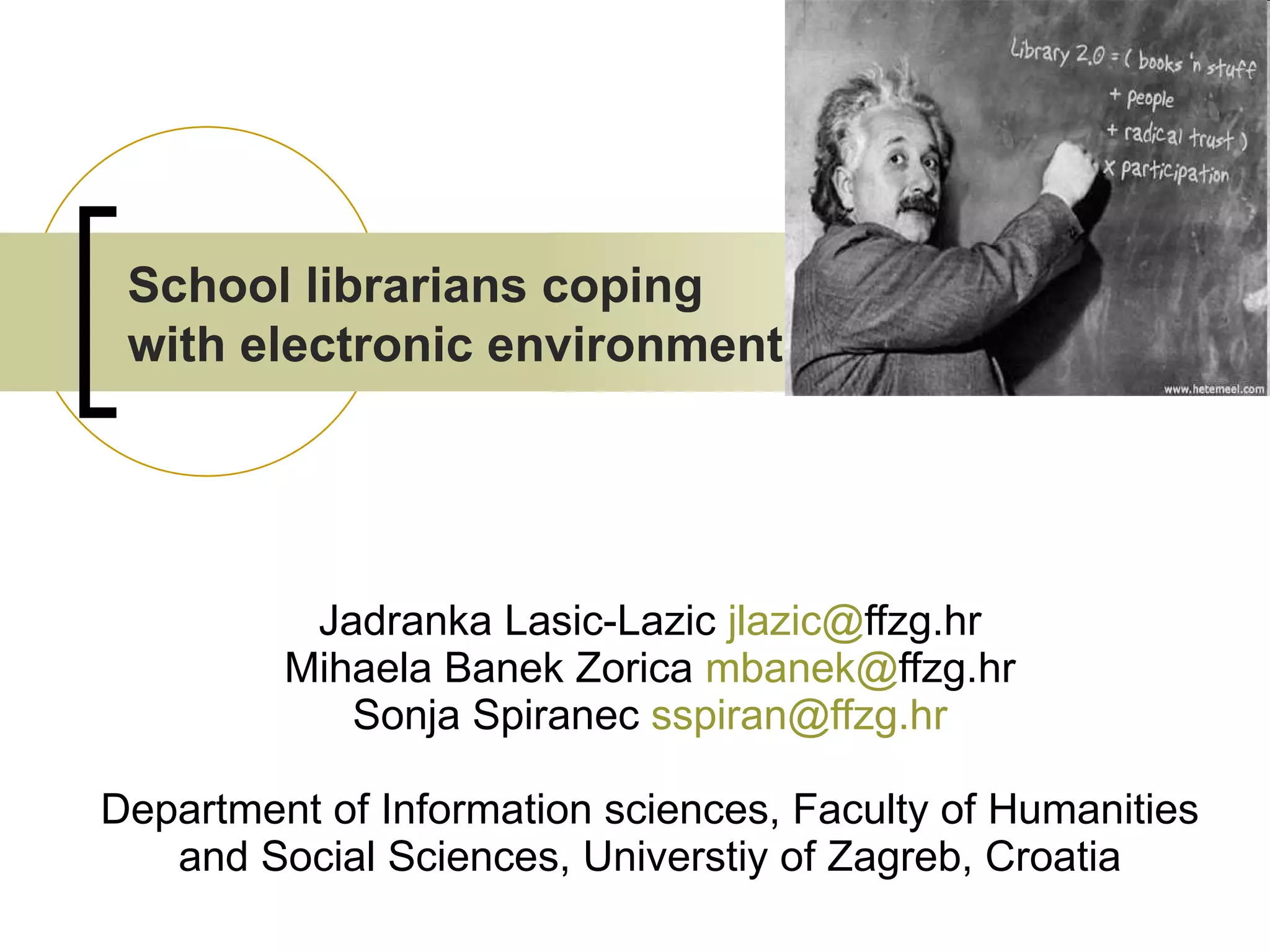 The document discusses the evolution of the web from Web 1.0 to Web 2.0 and the concept of Library 2.0 as a reaction to developments in information and communication technologies. It notes that most students are familiar with popular Web 2.0 tools like wikis, blogs, YouTube and social media, but less than half have knowledge of tools like Flickr, Delicious or Second Life. The document also discusses how the Department of Information Sciences at the University of Zagreb introduced new courses on information literacy and e-learning and how libraries and educational institutions are using virtual worlds like Second Life for teaching and learning.