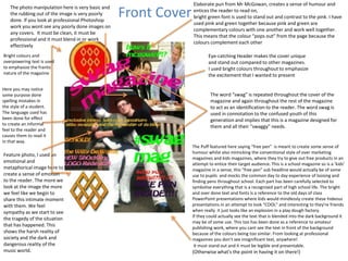 The document analyzes and critiques the design elements of a school magazine cover and contents page. On the cover, bright colors and text are used to emphasize an excited tone, while images and puns aim to elicit emotion and humor from readers. However, the text is too large and colors too contrasting compared to professional magazines. The contents page justifies text to the bottom and includes large photos, but it could be improved by simplifying the design and focusing on text and image quality. Overall, the analysis identifies amateur aspects that do not meet professional magazine standards.
