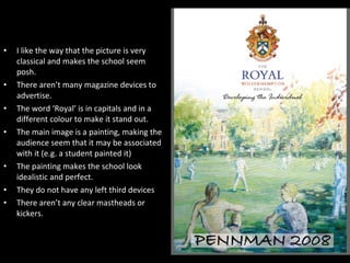 The document compares two magazine covers. The first cover features a classical painting of a school, with the word "Royal" in capital letters and a different color to stand out. It does not include many advertising devices. The second cover has a clear masthead to establish the brand and name, along with controversial subheadings. It features a clear main image of a model who is a student, and has a classic fashion magazine layout, though it is not clear who the target audience is intended to be.