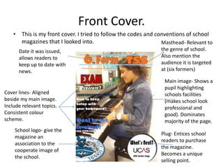 This document summarizes the evaluation of a school magazine front cover created by the author. The summary includes details on the masthead, cover lines, main image of a student, and consistency of the color scheme. It also discusses how the magazine relates to its target audience of 6th form students and what technologies and skills the author learned through creating the magazine.