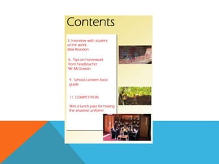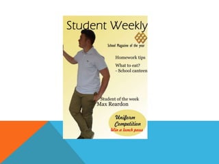 The document provides an evaluation of the design elements of a school magazine cover and contents page. It notes that the masthead font is basic but creates a professional tone. The feature photo quality is good but could be better cut out. The "School magazine of the year" puff uses small, squished font that does not stand out. The plugs are not well aligned and make the magazine seem less professional. The filler uses a handwriting font that can be hard to read and includes red text that does not fit the house style. The contents page photos are low quality, not aligned, and irrelevant to articles. The sells and font also do not match the house style and there is a lot of negative space. Photoshop