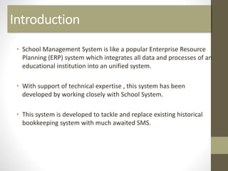 The document describes a School Management System (SMS) that was developed to replace an institution's existing bookkeeping system. It discusses the scope, modules, and features of the SMS, including modules for administration, teaching staff, parents, and students. Entity relationship diagrams and use case, sequence, and activity diagrams are presented to illustrate the system design. Potential drawbacks around authorization and performance are noted, as well as proposed future enhancements like attendance tracking, email/SMS alerts, and an online exam facility. The conclusion states that the SMS will enhance management of educational institutions.