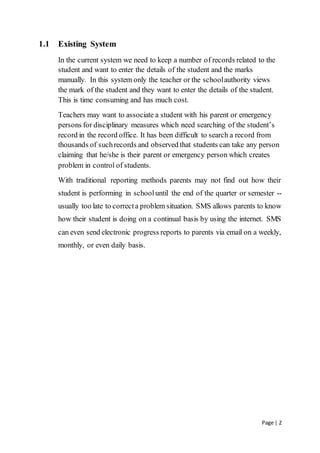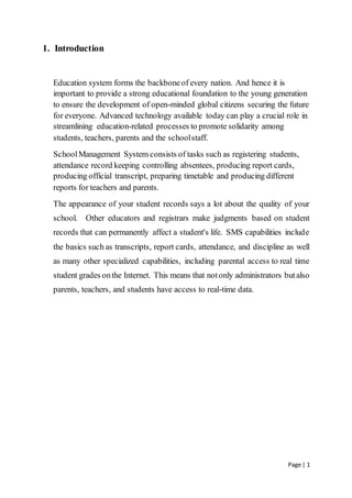 This document provides an overview of a proposed School Management System. It discusses the need to streamline education processes using technology. The existing paper-based system is time-consuming and costly. The proposed system would allow students, teachers, parents and administrators to access up-to-date student information and records in real-time through a centralized database. It would manage tasks like student registration, attendance tracking, report cards, transcripts and more efficiently. The system would use a waterfall model and prototyping approach.