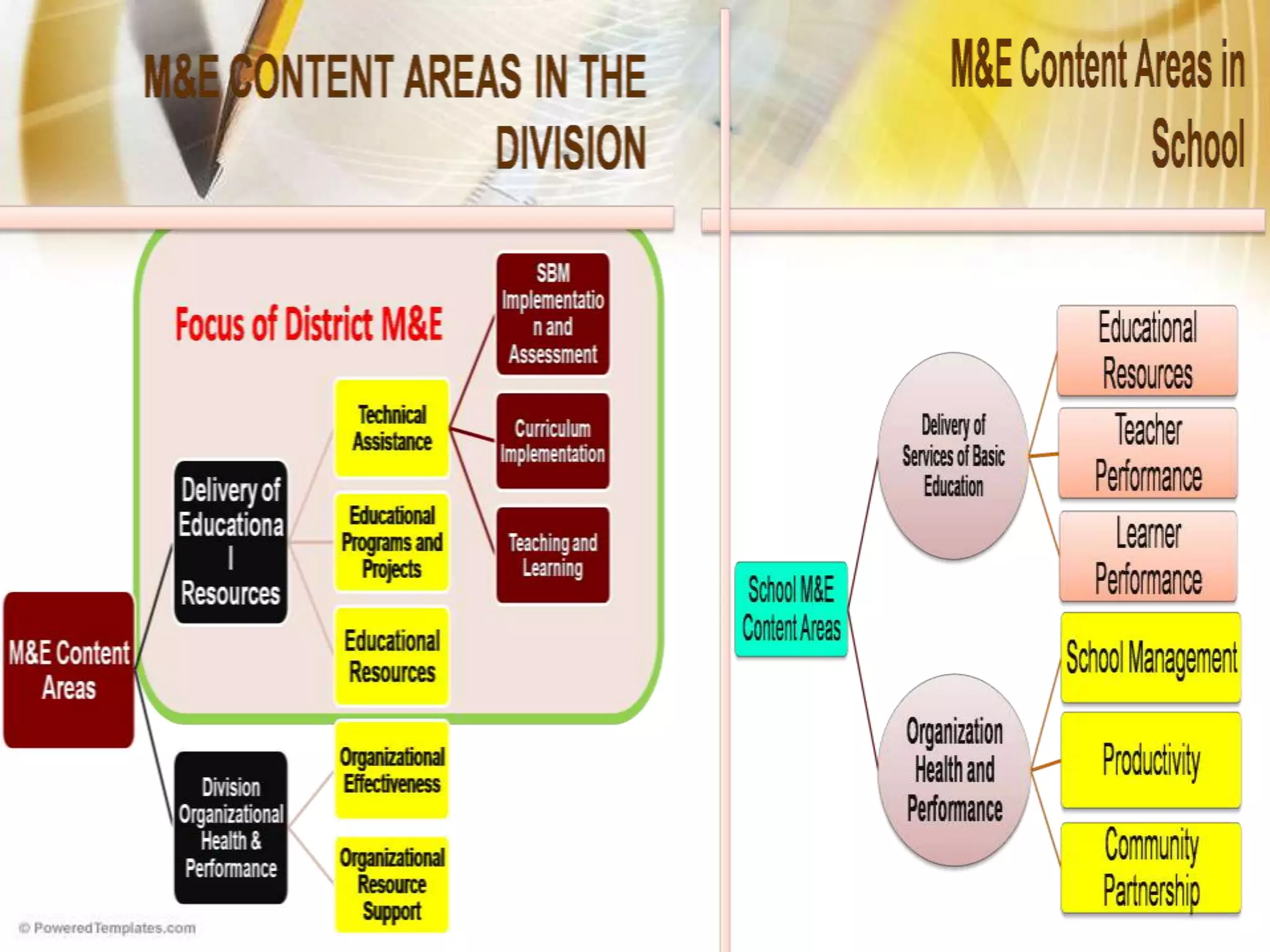The document discusses school monitoring and evaluation (M&E) frameworks. It explains that the objectives of school M&E are to provide information on implementing programs and projects to improve plans, assess resource use, improve teacher performance, and monitor student performance. The document also outlines M&E content areas like delivery of basic education, educational resources, teacher performance, learner performance, organization health, and community partnerships. Finally, it discusses integrating these content areas with M&E task levels like planning, implementation, monitoring, evaluation, and reporting.