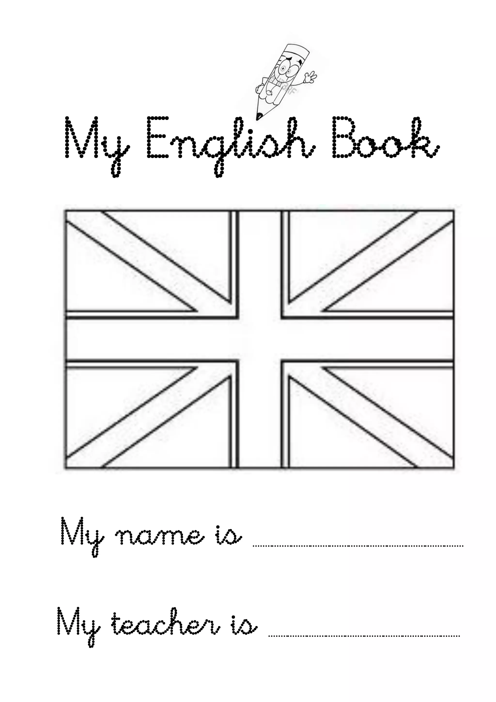 The document is a table of contents for an English workbook. It lists contents like personal information (name, gender), school objects, colors, shapes, family members, transportation, numbers, vowels, and animals. Each section is meant to teach English vocabulary through exercises like coloring, tracing, and matching pictures with words.