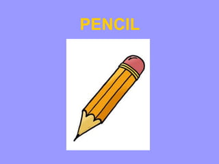 This list contains common school supplies including a pencil, teacher, desk, rubber eraser, glue, book, notebook, pencil sharpener, scissors, and crayons that students may use in their classrooms.