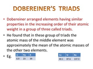 The document discusses the history and development of the periodic table from Dobereiner's law of triads to Mendeleev's periodic table to the modern periodic table. It summarizes key features of the modern periodic table including its organization into periods and groups based on atomic number, trends in properties from period to period and group to group, and classification of elements into s, p, d and f blocks based on electron configuration.