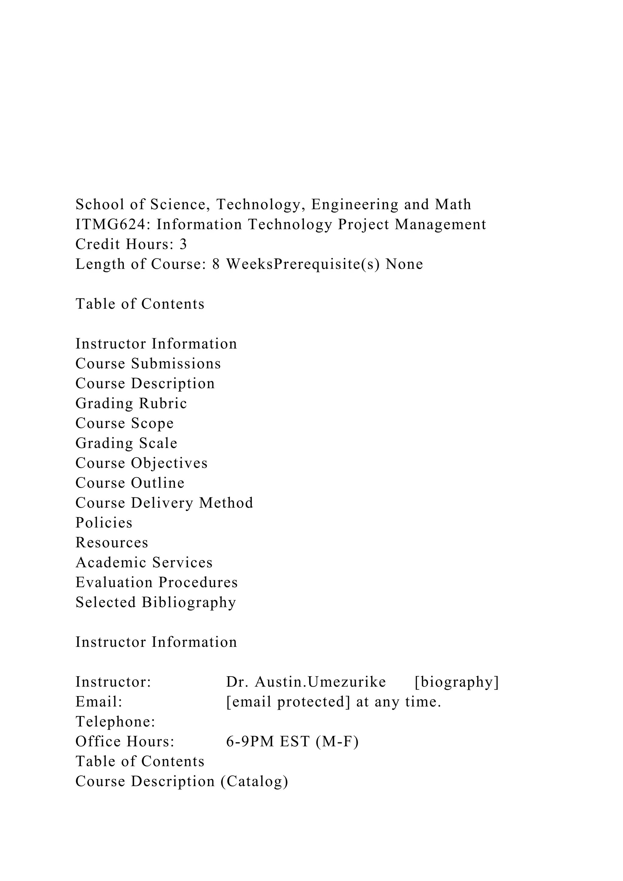 The document outlines a course on Information Technology Project Management (ITMG624) offered over eight weeks, emphasizing project management principles, methods, and various system development life cycle models. Key topics include risk management, project metrics, and effective communication strategies, with specific assignments like article summaries and research papers aimed at applying learned concepts. The course is designed for distance learning, requiring students to utilize Microsoft Project and participate in forum discussions to enhance their understanding and engagement.