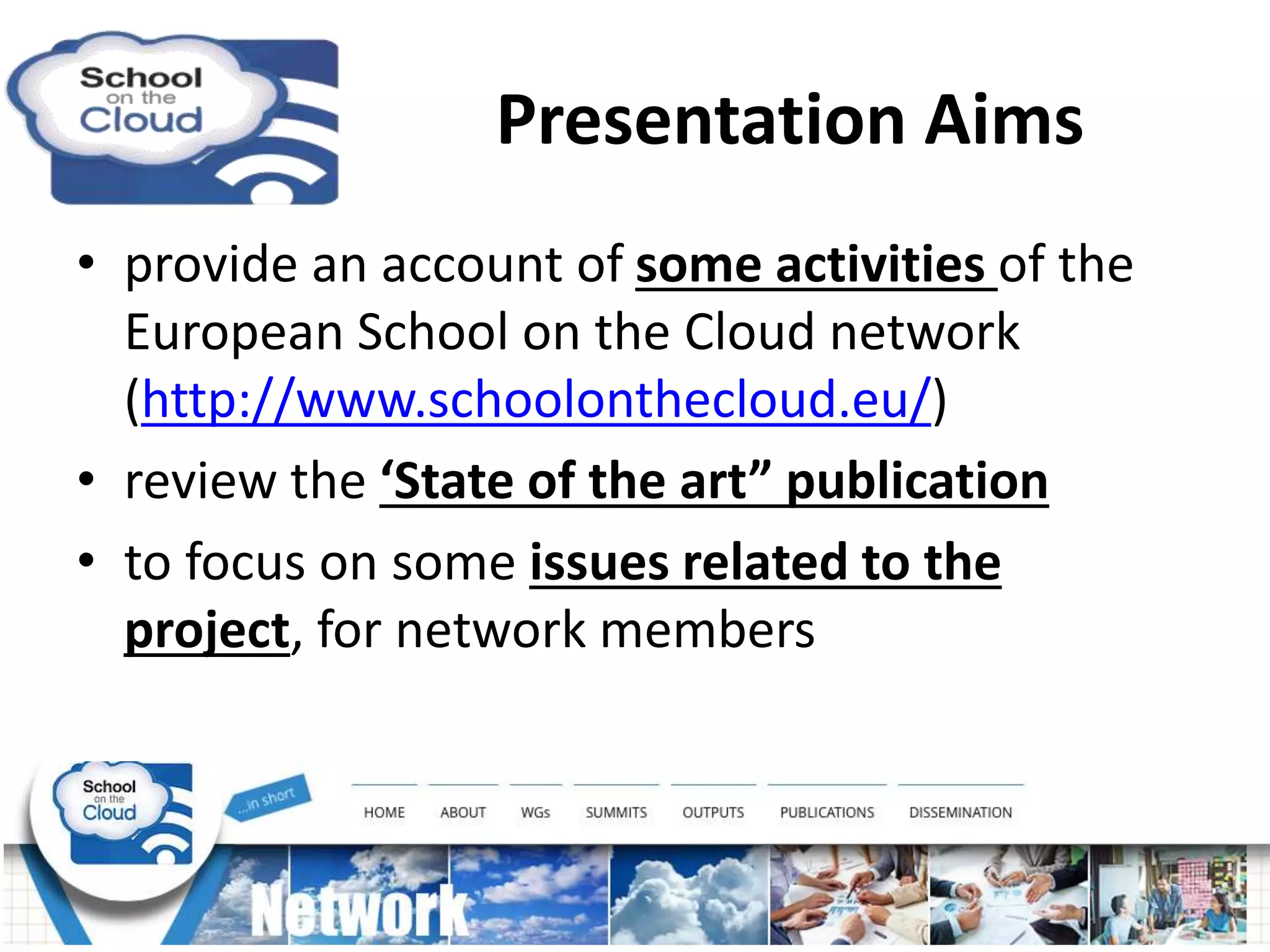 The document summarizes activities of the European School on the Cloud network, which aims to explore how education should respond to the potential of cloud computing. The network has 57 partners across Europe researching the impact of the cloud on education stakeholders. It has four working groups focusing on cloud leadership, innovative teaching, personalized learning, and future education scenarios. The network also published a state of the art report on cloud computing in education across Europe, finding a variety of isolated initiatives and developments in different countries. The network seeks to provide guidance and support to stakeholders on utilizing cloud technologies and developing cloud-based educational solutions and services.