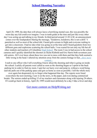 The document discusses school shootings from several perspectives. It describes the 1999 Columbine High School shooting and provides statistics on school shootings between 2011-2015. It discusses the goals of a program that aims to identify students at risk of violence. It also examines the aftermath for both victims and shooters, and debates whether killers taking their own lives is justice or an "easy way out." Finally, it suggests steps schools can take to increase protection, such as installing metal detectors.