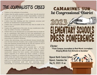 The document outlines the program and details of a campus journalism contest, including registration, opening and closing ceremonies, performances, and award presentations. It features various committees and their roles, as well as a set of principles known as the journalist's creed that emphasizes the responsibilities and ethics of journalism. The event aims to foster skills in journalistic practices among students, tying together themes of public service and accountability.