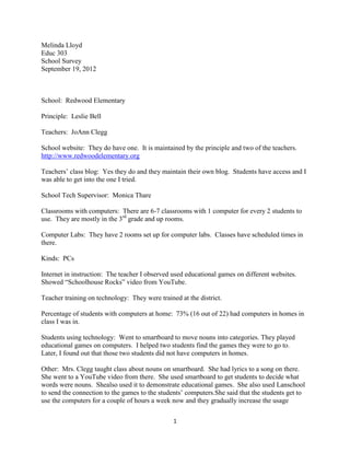 This document summarizes the results of a school survey conducted at Redwood Elementary School. It notes that the school has a website and teacher blogs maintained by staff. Most classrooms have 1 computer for every 2 students, and there are two computer labs. Teachers received district technology training and integrate tools like educational games, YouTube videos, and a smartboard into lessons. While 73% of students in one class had computers at home, two students who struggled with technology did not.