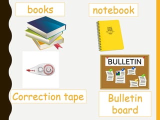 The document lists various school supplies including backpacks, pencils, notebooks, books, markers, computers, calculators, glue, sharpeners, and whiteboards. It also contains exercises asking the reader to point to or identify various school supplies, count items, match demonstrative pronouns to nouns, identify singular and plural forms of words, and help Harry Potter pick necessary school supplies for Hogwarts.