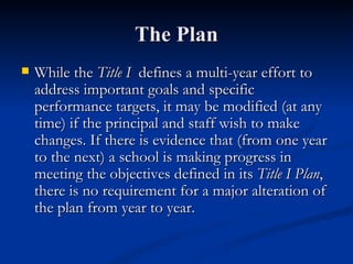 This document outlines a Title I school improvement plan. The plan may be modified over time based on progress. Key elements include instructional strategies like differentiated instruction, additional instructional time for students, and ensuring all teachers are highly qualified. Goals include decreasing the percentage of students not meeting reading standards and increasing the percentage exceeding math standards. Strategies to support lower-performing students and increase parental involvement are described. Teachers were included in decision-making and will take on leadership roles such as the leadership team, student support team, and departmental chairs to strategically plan and implement best practices.