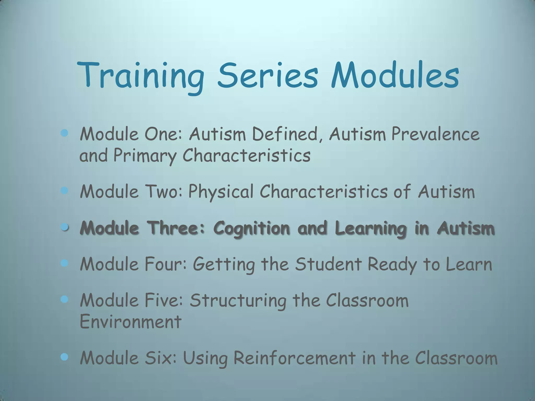 The document outlines 21 training modules on autism spectrum disorders for educators. It discusses the wide range of cognitive abilities in autism from intellectual disability to gifted. Key strategies for teaching students with autism include using visual aids like objects, pictures and words; teaching skills in each environment; and allowing extra time for processing information.