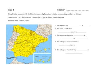 This document summarizes a French student's 6-day trip to Portugal as part of a school exchange program. It provides a daily journal of activities and experiences, including visiting family hosts, touring local schools and attractions, and experiencing Portuguese cuisine. Key places visited included Faro, Palma de Majorca, Olhão, and Barcelona. The student enjoyed learning about Portuguese culture and was impressed by the country's connection to the sea. Their favorite part of the trip was spending time with their host family.