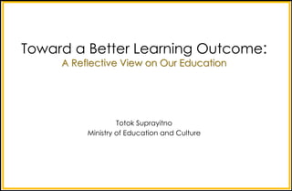 1) The document discusses issues with Indonesia's current education system and proposes ways to improve learning outcomes.