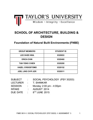 The document appears to be a report for a group assignment on social psychology concepts for a class. It includes an introduction outlining the assignment requirements to produce a video and presentation applying 5 social psychology theories. The document then summarizes the group's video applying the concepts of stereotype, attitude formation, confirmation bias, social loafing, and ingratiation. It provides details on the group's method, discussion of the concepts used, and a link to the video produced.