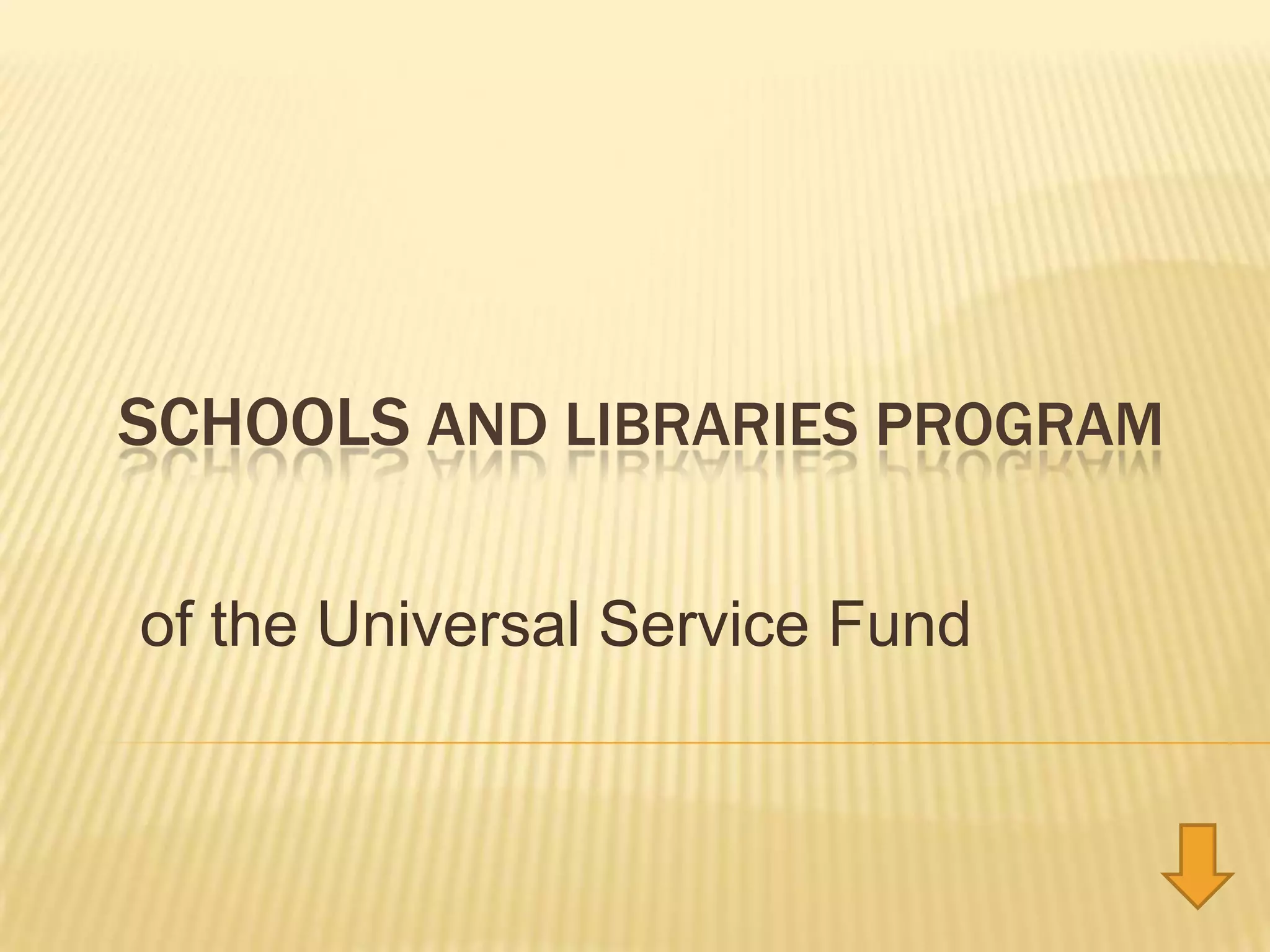 The Schools and Libraries Program of the Universal Service Fund helps schools and libraries in the US obtain discounted internet access and telecommunications services by collecting and distributing funds. Most schools and libraries are eligible if they comply with the No Child Left Behind Act, the Library Services and Technology Act, and submit a technology plan assessing needs. Schools must also have a campus technology plan addressing teaching and learning, educator preparation, administration, infrastructure and budget. The program is making progress towards its goals and meeting current needs while identifying future needs.