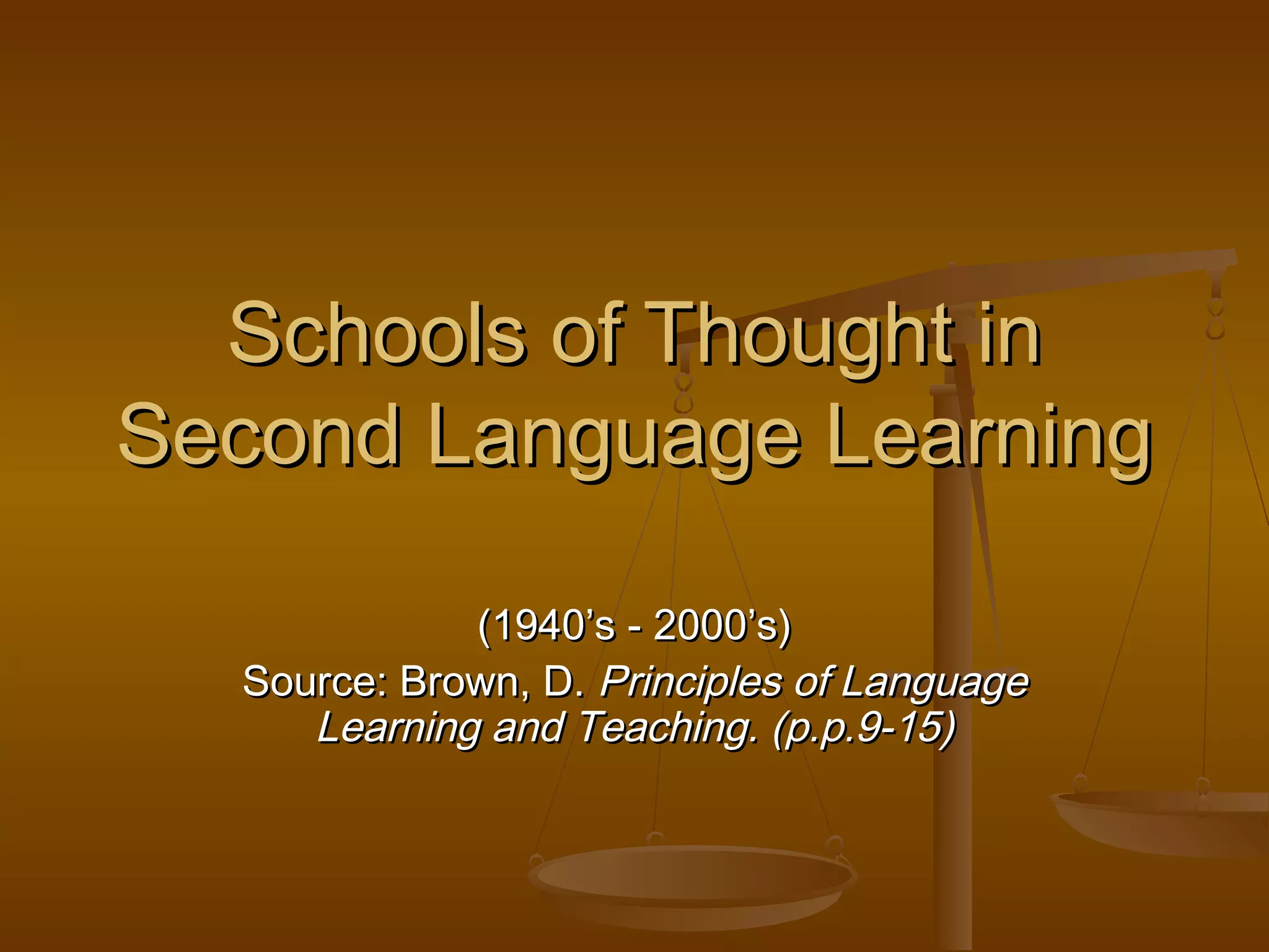 This document summarizes schools of thought in second language learning from the 1940s to 2000s. It describes how behaviorism and structural linguistics were dominant in the 1940s-1950s, focusing only on observable behaviors and language units. In the 1960s, cognitive psychology and transformational-generative linguistics emerged, considering mental processes, meaning, and innate language abilities. Finally, constructivism developed in the 1980s-2000s, emphasizing learners' active role in constructing understanding through individual cognitive processes and social interaction. The document concludes that no single theory can fully explain language learning.