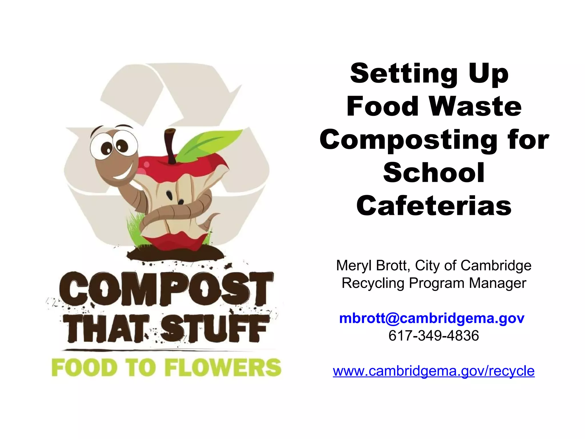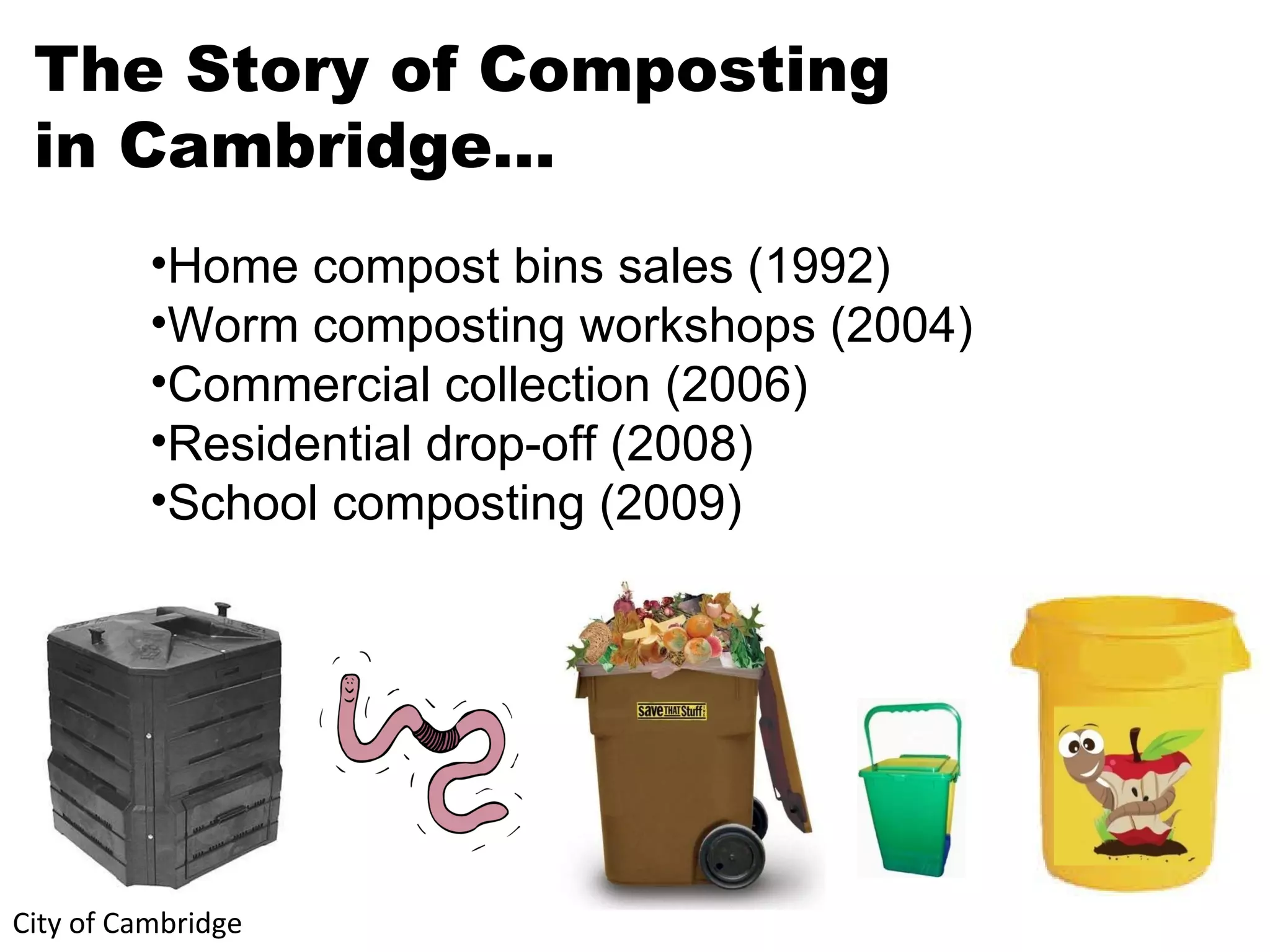The City of Cambridge has implemented a food waste composting program in school cafeterias. The program began with three pilot schools in 2009 and has since expanded to include ten schools. On average, the program collects 15-20 pounds of food waste per 100 students each day. From March 2009 to March 2011, over 18 tons of food waste was collected and composted through the school program. The city provides education, labeling, and collection services to make lunchroom composting easy for students and staff.