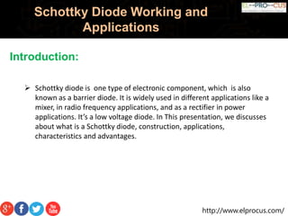 The document discusses the working, construction, characteristics, and applications of Schottky diodes, which are low voltage electronic components known for their fast switching speed and efficiency. It explains the formation of a Schottky barrier through a metal-semiconductor junction and highlights their advantages over traditional diodes, including lower forward voltage drop and quick recovery times. Schottky diodes are commonly used in applications requiring voltage clamping, rectification in power supplies, and high-speed switching.